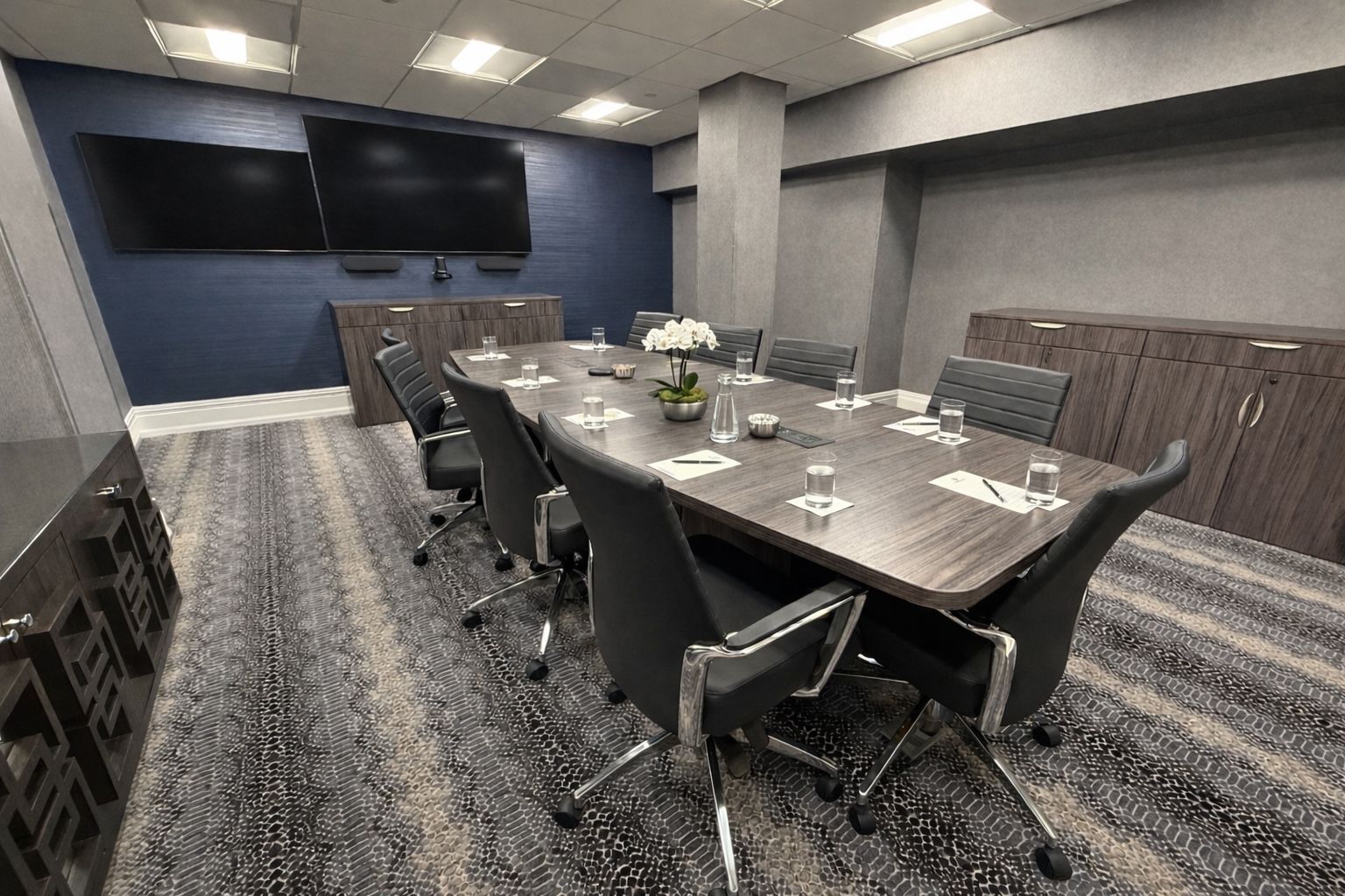 Elevate your next meeting in the state-of-the-art Conference Room. Spanning 340 square feet, the space comfortably seats up to 10 guests and features a modern conference table, dual Samsung 4K displays, and the advanced Logitech Rally Plus video conferencing system.